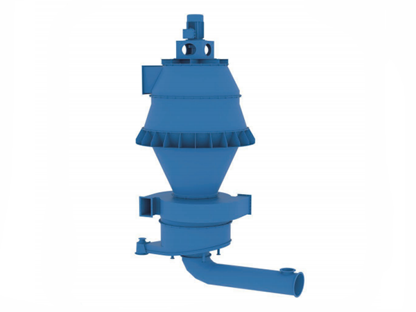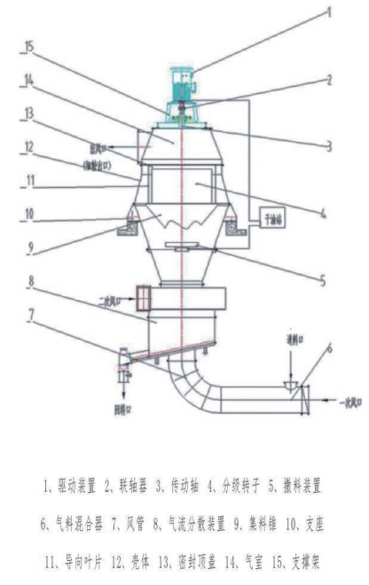 一、二次氣體從各自的空氣入口進(jìn)入選粉機(jī),通過(guò)具有一定角度的固定導(dǎo)向葉片與轉(zhuǎn)子的格板形成渦流,三次空氣由氣流分散裝置下部吹入選粉機(jī)。
