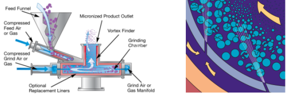 【特點(diǎn)】:研磨室結(jié)構(gòu)采用兩整塊鋼板CNC加工制成,無任何焊縫和轉(zhuǎn)動(dòng)部件,無任何死角,易拆裝清洗,產(chǎn)品純度高;氣體絕熱膨脹加速,并伴有降溫,粒子高速碰撞會(huì)使溫度升高,但由于絕熱膨脹使溫度降低,所以在整個(gè)粉碎過程中,物料的溫度不高,這對熱敏性或低熔點(diǎn)材料的粉碎尤為適用;可輕松實(shí)現(xiàn)在線清洗(CIP)和在線滅菌(SIP),適合注射級無菌藥的生產(chǎn);產(chǎn)品平均粒度小,一般小于5μm(粉碎比一般為1~50),亦有利于團(tuán)聚體的打散。